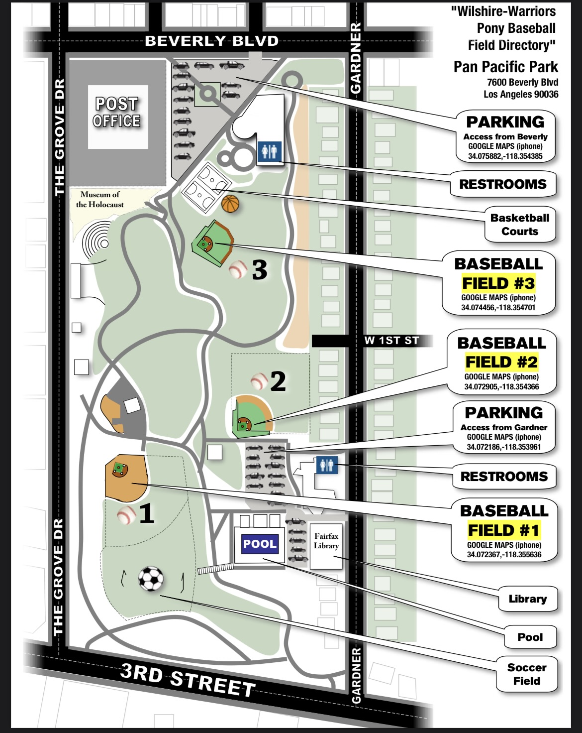 All of our practices and games are held at Pan Pacific Park on baseball fields 1, 2, or 3.